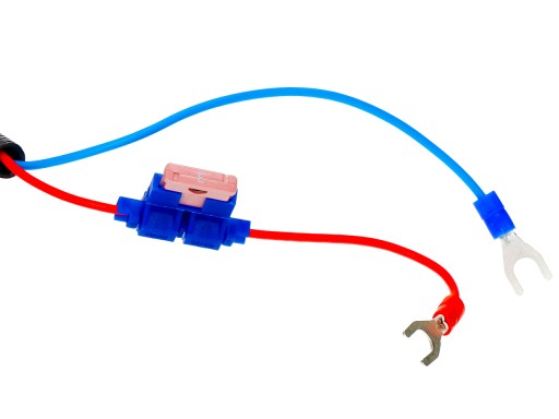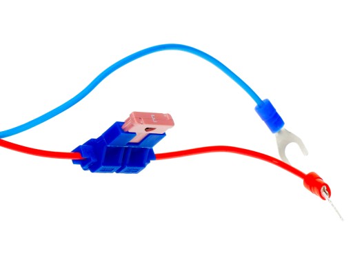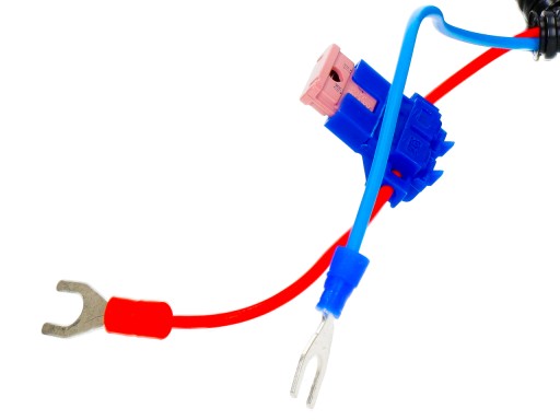 4. Podłącz przewody urządzenia do klem akumulatora. Czerwony (+) kabel podłączyć do bieguna dodatniego, niebieski (-) do bieguna ujemnego. Nie musisz w tym celu nawet odkręcać nakrętek na klemach. Końcówki montażowe są skonstruowane tak, że wystarczy jedynie odkręcić nakrętkę klemy do takiego poziomu by wsunąć końcówkę przewodu i dokręcić śrubę. Taka konstrukcja kabli zasilających pozwala również na łatwy demontaż urządzenia.