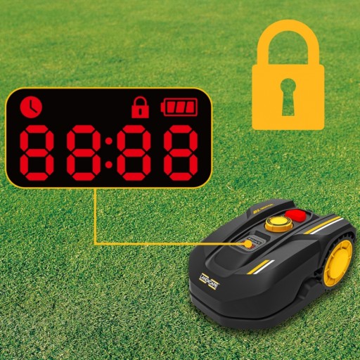 Wbudowany, czytelny wyświetlacz cyfrowy sprawia, że konfiguracja zautomatyzowanej kosiarki Landxcape jest dziecinnie prosta, gdy dostosowujesz czas pracy lub ustawiasz blokadę zabezpieczającą przed kradzieżą za pomocą kodu PIN
