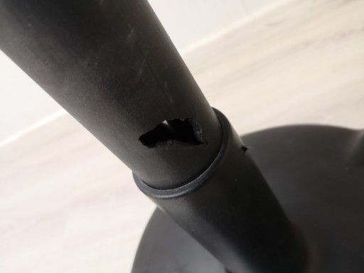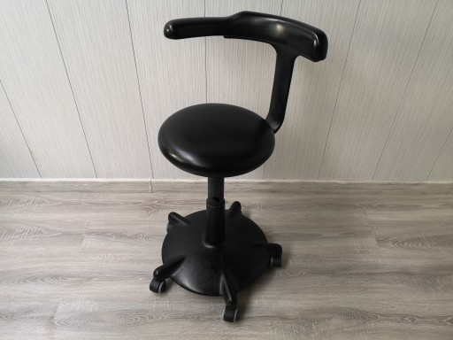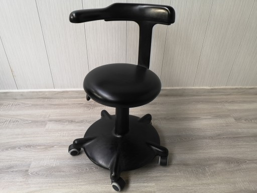 regulacja wysokości siedziska 46-64, na kółkach, materiał tworzywo sztuczne, lekkie zbrudzenia widoczne na zdjęciach, otarcie na oparciu solidne i dobrze wykonane, bardzo ciężkie masywne, sprężynuje ok 5 cm (zapada się pod ciężarem - nie wiem czy tak ma być w przypadku tych krzeseł) nawet z tym bardzo bardzo wygodne, siedzi się miękko mimo, że siedzisko twarde