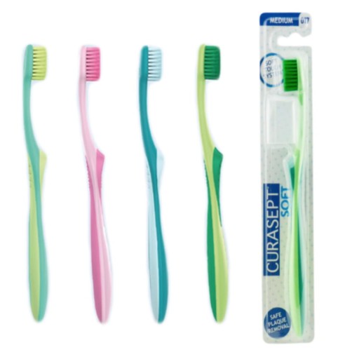 Curasept Medium 017 to szczoteczka do zębów o dużej liczbie miękkich włosków działa na zęby i dziąsła w sposób równomierny i delikatny, skutecznie i gruntownie usuwając płytkę nazębną na całej powierzchni. Dzięki technologii Soft Touch System szczoteczka Curasept Medium bardziej skutecznie usuwa i niszczy płytkę nazębną niż tradycyjne szczoteczki do zębów.