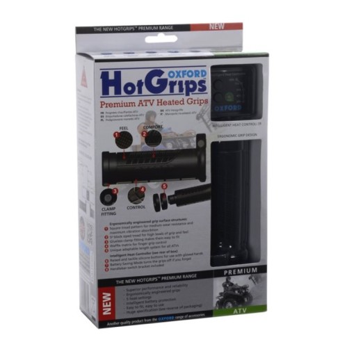 Nowa seria manetek podgrzewanych do pojazdów ATV, quadów z nowym panelem sterującym V8, umożliwiającym precyzyjne dopasowanie temperatury grzania w sześciu mocach: 0%, 30%, 40%, 50%, 75% i 100%. Nowy panel sterujący został wyposażony w wypukle przyciski, pozwalające na ich precyzyjną obsługę w rękawicach motocyklowych. Wykonane z monolitycznego odlewu z miękkiej gumy z zatopionymi elementami grzewczymi. Prosty montaż z możliwością dopasowania poprzez przycięcie końcówek. Faktura manetek specjalnie zaprojektowana w celu zapewnienia komfortu oraz pewnego chwytu. Specjalnie zaprogramowany regulator zapobiega całkowitemu rozładowaniu akumulatora w trakcie używania manetek na postoju. Podgrzewane manetki Oxford cechują się: