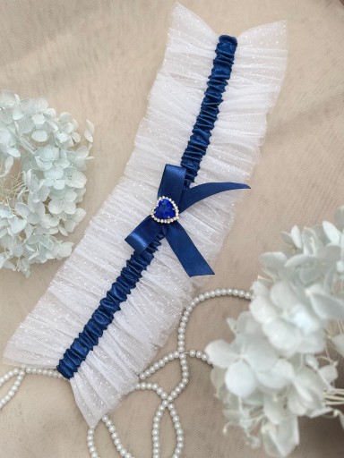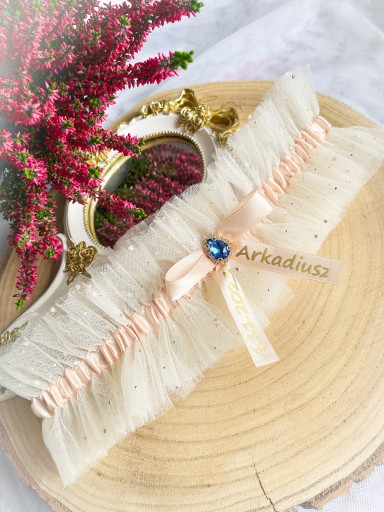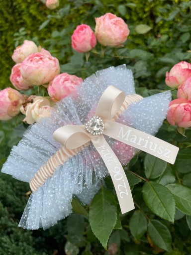Podwiązka ślub tiulowa biała brokat rożne ozdoby+data ślubu na wymiar