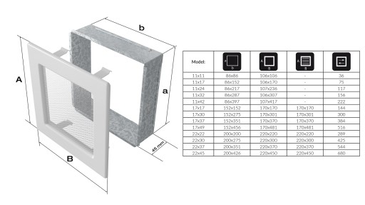 - Kieszeń pozwalającą zamontować kratke w ścianie.