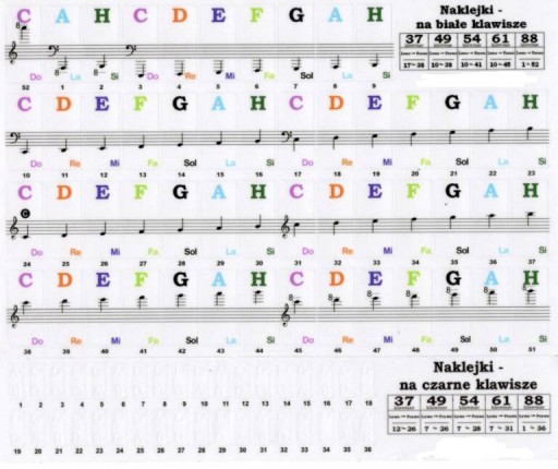 - Uniwersalne naklejki do klawiszy 37, 49, 54, 61, 88 o standardowej wielkości C-D-E-F-G-A-H-C