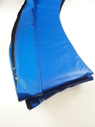 Nowy rozdział w produkcji osłon do trampolin: Polichlorek winylu - właściwości termoplastyczne, wysoka wytrzymałość mechaniczna oraz na działanie wielu rozpuszczalników. Osłony z tego tworzywa można umyć środkami chemicznymi. Nie zaszkodzą im również żrące, ptasie odchody, które osłabiają osłony z polietylenu. Osłona jest odporna na trudne warunki atmosferyczne i promieniowanie słoneczne i nie pęka. Jest estetycznie wykonana, prawidłowo zakrywa sprężyny i inne elementy metalowe. Zachodzi około 5 cm na matę. Przy takiej szerokości dziecku nie wpadnie noga pomiędzy sprężyny. Jest miękka i ładnie się układa na ramie trampoliny. Szeroka: 26 -27 cm i dodatkowo 10 cm, które opadając w dół zakrywa rury ramy od zewnątrz. Grubość pianki wszytej w osłonę: 12 mm - jest sztywna, nie fruwa. Mocowana do ramy wiązaniem z gumy - na luźno.