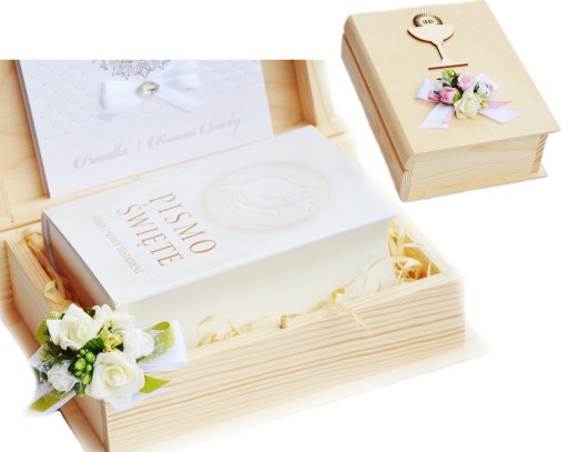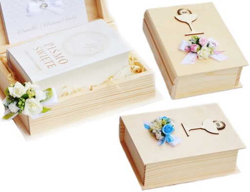 - elegancką, drewnianą szkatułkę w kształcie książki z indywidualną, ręcznie wykonaną dekoracją; wymiar szkatułki 24x19x10cm