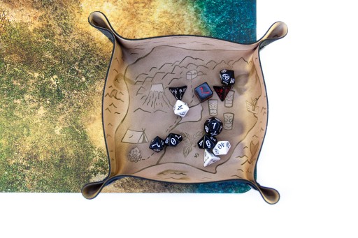 Dice tray jest wykonany z gumy o grubości 2 mm, znanej z mat do gier karcianych. W narożnikach znajdują się wytrzymałe, plastikowe napy, dzięki którym płaską matę możemy zamienić w miseczkę do rzucania kośćmi.