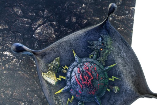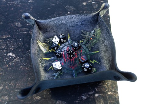 Dice tray jest wykonany z gumy o grubości 2 mm, znanej z mat do gier karcianych. W narożnikach znajdują się wytrzymałe, plastikowe napy, dzięki którym płaską matę możemy zamienić w miseczkę do rzucania kośćmi.