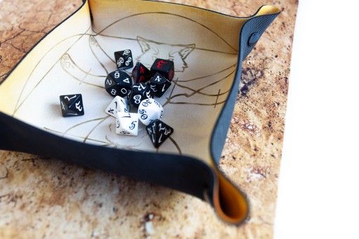 Dice tray jest wykonany z gumy o grubości 2 mm, znanej z mat do gier karcianych. W narożnikach znajdują się wytrzymałe, plastikowe napy, dzięki którym płaską matę możemy zamienić w miseczkę do rzucania kośćmi.