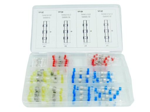 Zestaw szybkozłączek z cyną w rurce termokurczliwej do naprawy i łączenia przewodów.