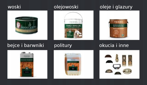 Jesteśmy wyłącznym importerem tradycyjnych materiałów do uszlachetniania drewna brytyjskiej firmy Fiddes & Son, która od ponad stu lat produkuje najwyższej klasy woski, oleje, olejowoski, barwniki do drewna i politury. Doświadczenie firmy w produkcji najwyższej jakości środków do pielęgnacji i ochrony drewna zaowocowało stworzeniem szerokiej oferty dla stolarzy, parkieciarzy, renowatorów oraz wszystkich zajmujących się zawodowo, jak też amatorsko pracą z drewnem. Nasze portfolio uzupełniają mosiężne oraz stalowe okucia meblowe przeznaczone do mebli klasycznych, antycznych, rustykalnych i również nowoczesnych. Posiadamy wieloletnie doświadczenie i dlatego służymy pomocą i doradztwem technicznym.