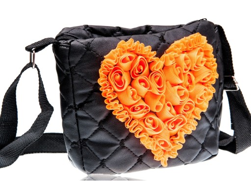 Torebka zapinana na suwak. Ozdobiona aplikacją w kształcie serca.