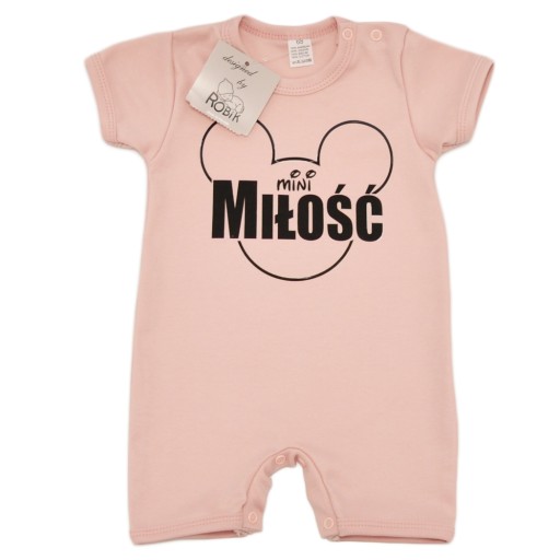 Pudrowo różowy rampers dziecięcy z krótkim rękawem na lato z nadrukiem i napisem.