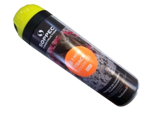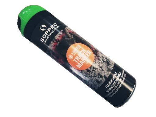 Track Marker firmy Soppec to farba fluorescencyjna w aerozolu przeznaczona do wykonywania oznaczeń na placach budowy oraz do znakowania przy pracach geodezyjnych i pomiarowych. Z jej pomocą wykonamy widoczne, odblaskowe oznaczenia, podkreślając niebezpieczne strefy, zaznaczając pole pod wykop lub znacząc dokonane pomiary. Dzięki farbie Track Marker niewielkim kosztem, znacznie zwiększymy bezpieczeństwo na budowie i usprawnimy pracę. Aerozol stosowany jest w sytuacjach gdy długotrwałe oznaczenia nie są pożądane, utrzymując się na znaczonym obszarze do 3 miesięcy.