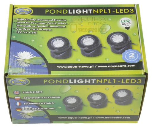 NPL1-LED3 to wysokiej jakości ledowe lampy oświetleniowe z czujnikiem zmierzchu do zbiorników wodnych i ogrodu. W zestawie znajduje się transformator niskonapięciowy, zmniejszający napięcie, co gwarantuje bezpieczeństwo zarówno mieszkańcom jak i użytkownikom oczka wodnego. Wejście: 230-240 V, 50Hz, wyjście 12V AC, przystosowany do użytku poza domem oraz posiada europejski certyfikat bezpieczeństwa CE. Zastosowane w lampach żarówki ledowe pozwalają na znaczne ograniczenie zużycia energii i zmniejszenie nagrzewania się lampy podczas pracy. Hermetyczna obudowa lamp sprawia, że mogą być one stosowane zarówno pod, jak i nad wodą. Wbudowany czujnik zmierzchu powoduje że lampy samoistnie włączają się gdy zapada zmrok i wyłączają w ciągu dnia.