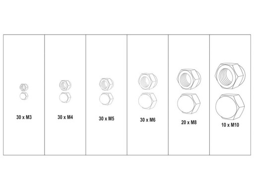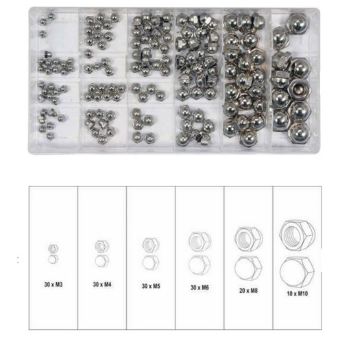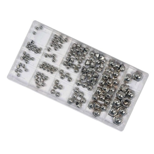 Zestaw 150 sztuk nakrętek metrycznych kołpakowych/zamkniętych. Zestaw zawiera rozmiary M3, M4, M5, M6, M8, M10.