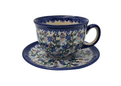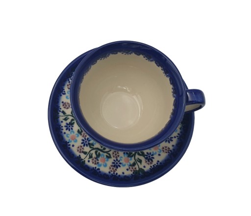 FILIŻANKA ZE SPODKIEM MALOWANA W TRADYCYJNEJ DEKORACJI BOLESŁAWIEC