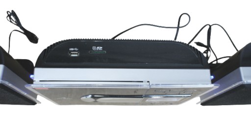 - złącza: 1 x wejście SD, 1 x port USB, 1 x wyjście słuchawkowe jack 3,5 mm, 1 x wejście jack AUX 3,5 mm, 1 x wyjście stereo cinch do podłączenia głośników