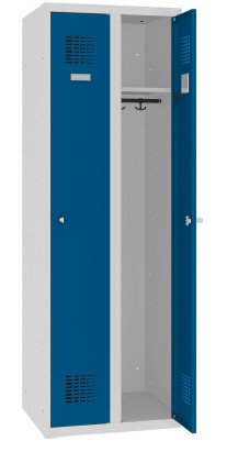 Metalowa dwudrzwiowa szafa ubraniowa. Wymiar : 1800x600x500 (wys x szer x gł). Szafa jest zmontowana. Zgrzewanie zapewnia wysoką jakość wykonania. Wyposażona jest w plastikowy drążek, wieszaki ubraniowe, haczyk na ręcznik lusterko oraz samoprzylepny plastikowy wizytownik. Zamykana zamkiem cylindrycznym w jednym punkcie. Drzwi szafy z perforacją o nowoczesnym designie. Światło pomiędzy półką wewnętrzną a wieńcem 300 mm. Konstrukcja oparta jest na profilach zamkniętych, które zastosowano w ścianach drzwiach oraz wieńcach środkowych i dolnych. Kolor jasny popiel RAL 7035.