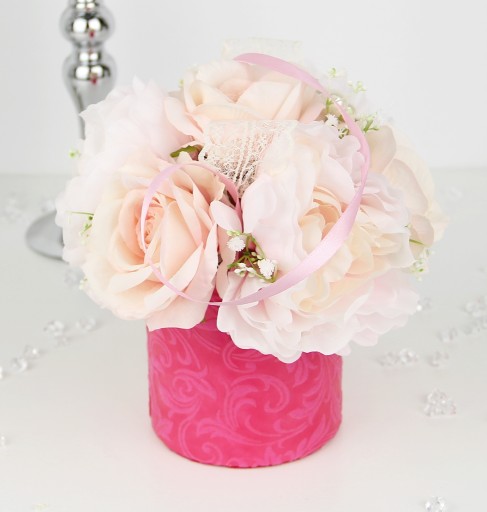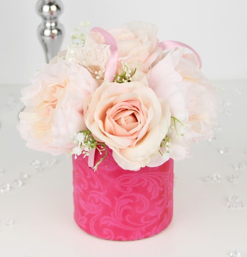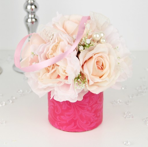 GOTOWY WIECZNY BUKIET z mixem kwiatów premium które wyglądają jak żywe - PUDROWE RÓŻE - PIWONIE - w flokowanym super RÓŻOWYM pudełku z wzorkiem - PRODUKT PL