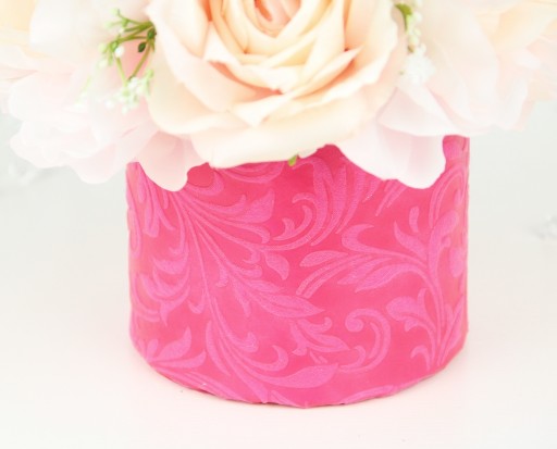 Pudełko jest z serii mniejszej - rozmiar XS wg. naszych oznaczeń. Kształt pudełka to klasyczna tuba w odcieniu mocnego różu. Zewnętrzna warstwa powleczona jest flokowanym materiałem z przetłoczonym florystycznym motywem - wzór listków.