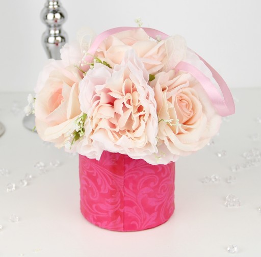 Piękny bukiet w ELEGANCKIM mocno różowym pudełku z flokowanego materiału z florystycznym, przetłaczanym wzorem.