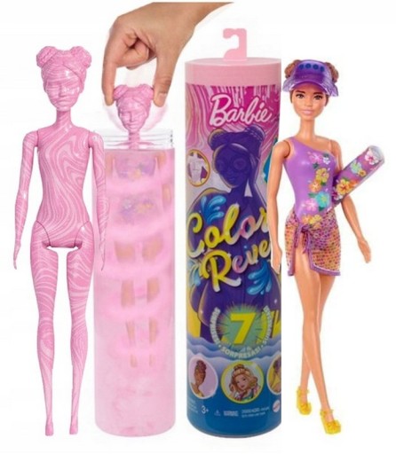 Woda zmieni kolor na pastelowy różowy, a po wyciągnięciu Barbie® odkryjesz jej wygląd!
