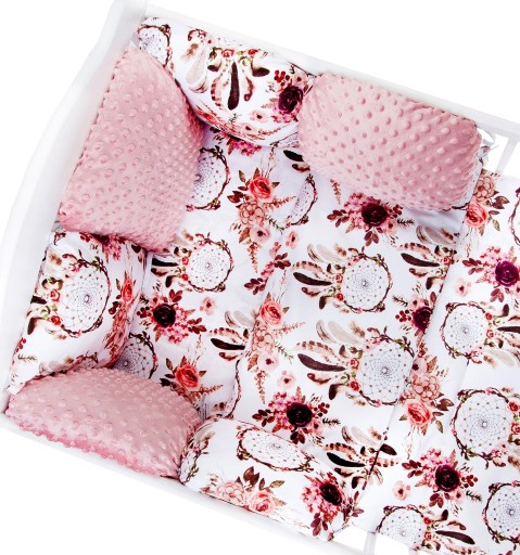 - 6 poduszeczek ok.30cmx30cm z troczkami tworzących ochraniacz do łóżeczka ( 3 poduszeczki minky i 3 poduszeczki bawełniane)