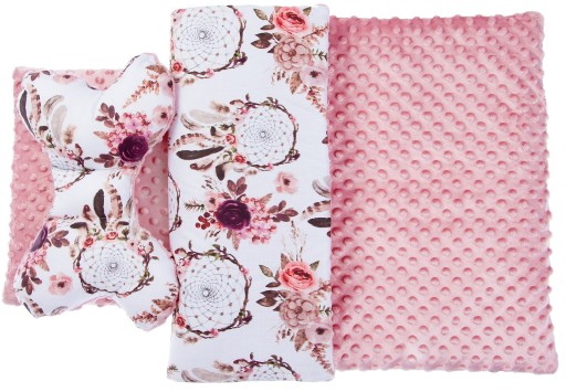 Wszystkie elementy zestawu są dwustronne, z jednej strony jest mięciutki materiał minky a z drugiej wzór bawełniany.
