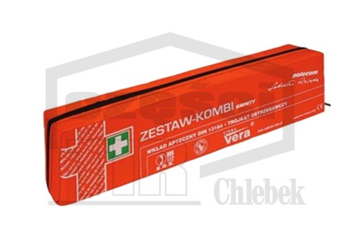 ZAWARTOŚĆ APTECZKI: 1 trójkąt ostrzegawczy z homologacją EU 1 kamizelka odblaskowa 1 rzep mocujący do tapicerki 1 szt. Opatrunek indywidualny G 2 szt. Opatrunek indywidualny M 1 szt. Opatrunek indywidualny K 1 kpl. Zestaw plastrów (14szt.) 1 szt. Przylepiec 5m x 2,5cm 2 szt. Opaska elastyczna 4m x 6cm 3 szt. Opaska elastyczna 4m x 8cm 1 szt. Chusta opatrunkowa 40 x 60cm 1 szt. Chusta opatrunkowa 60 x 80cm 3 szt. Kompres 10x10cm (pak po 2szt.) 2 szt. Chusta trójkątna 1 szt. Nożyczki 14,5cm 4 szt. Rękawice winylowe 1 szt. Koc ratunkowy 160 x 210cm 2 szt. Chusteczka nasączona 1 szt. Ustnik do sztucznego oddychania 1 szt. Instrukcja udzielania pierwszej pomocy z wykazem telefonów alarmowych.