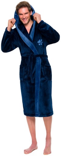 Szlafrok męski z kapturem, wiązany w pasie, z miękkiej dzianiny (soft), na biodrach kieszenie zewnętrzne, na wysokości klatki piersiowej naszyta aplikacja. Miły i przyjemny w dotyku, gwarantuje komfort noszenia.