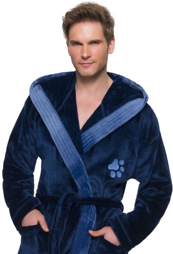 Szlafrok męski z kapturem, wiązany w pasie, z miękkiej dzianiny (soft), na biodrach kieszenie zewnętrzne, na wysokości klatki piersiowej naszyta aplikacja. Miły i przyjemny w dotyku, gwarantuje komfort noszenia.