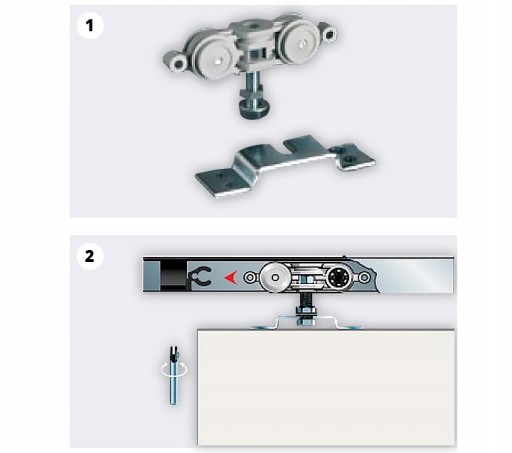 Montowane bezpośrednio na prowadnicy aluminiowej. Śruba regulacyjna pozostaje dostępna po montażu co pozwala na bezpośrednią korektę położenia drzwi.