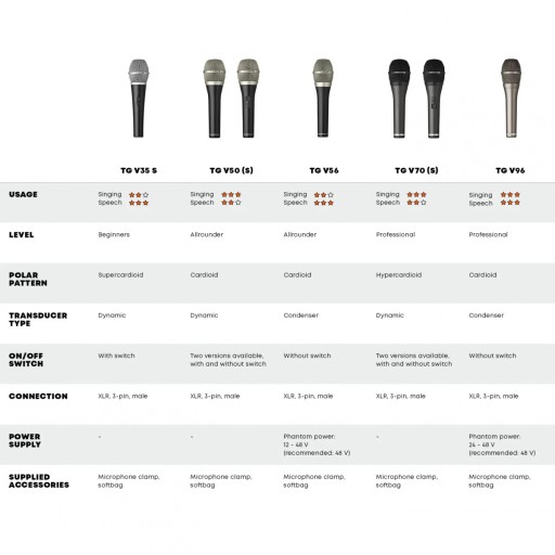 Model Beyerdynamic TG-V 56 c to mikrofon pojemnościowy o charakterystyce karioidalnej przeznaczony do zastosowań wokalnych na scenie lub w sali odsłuchowej. Dzięki dobrej rozdzielczości typowej dla mikrofonów pojemnościowych nadaj się on do szeregu zastosowań wokalnych w szerokim spektrum rodzajów i gatunków muzycznych. Subtelne podbicie tonów średnich zapewnia wyjątkowo transparentne brzmienie a zaawansowany system montażu przetwornika eliminację zakłóceń mechanicznych.