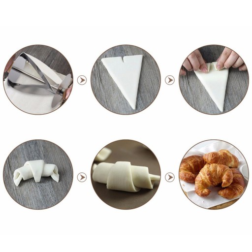 Dzięki konstrukcji ze skrzyżowanymi ostrzami wałek toczy się po cieście, aby uzyskać trzy trójkątne kawałki ciasta o jednakowej wielkości.