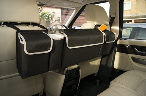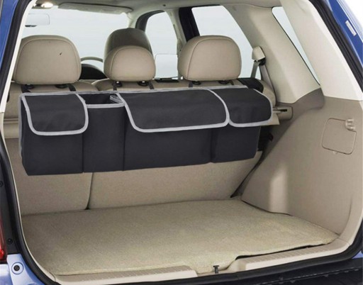 Organizer samochodowy z czterema kieszeniami (3 zamykane na rzep ) oraz trzema regulowanymi pasami mocującymi , przeznaczony do zawieszenia na tylnej kanapie pojazdu (wewnątrz bagażnika) lub za fotelami.
