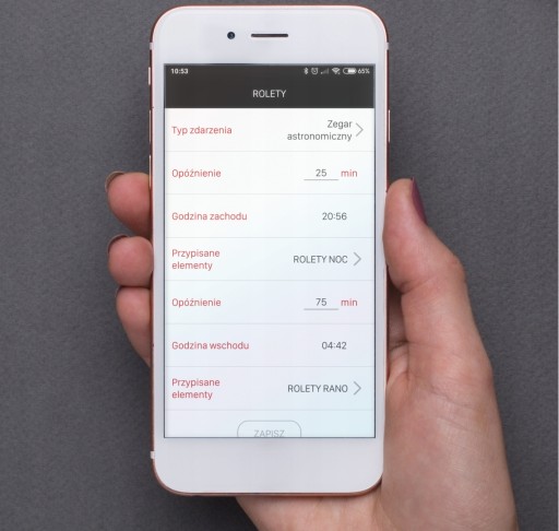 Aplikacja umożliwia zarządzanie roletami z podziałem na poziomy i pomieszczenia budynku. Ikony widoczne w aplikacji pozwalają na opuszczanie/podnoszenie wszystkich rolet jednym kliknięciem. Opcja zaprogramowania funkcji czasowych umożliwia użytkownikom systemu sterowanie roletami zgodnie z zadanym harmonogramem.