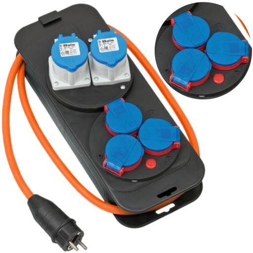 - Gniazda: wtyk ochronny (230 V / 16 A), 2 gniazda CEE (230 V / 16 A), 3 gniazda z zestykiem ochronnym (230 V / 16 A)