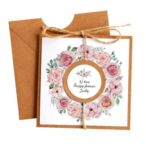 Kartka okolicznościowa na KOMUNIĘ - Kwiaty Różowe Piękna, ręcznie robiona, składana kartka okolicznościowa z okazji Pierwszej Komunii Świętej. OPIS: Napis na kartce - "W dniu Pierwszej Komunii Świętej". Do kartki w komplecie dołączamy kopertę eco z wyciętym otworem na kokardkę ze sznurka oraz dodatkową karteczkę z nadrukowanymi życzeniami (losowo wybierane). Możesz więc wypisać życzenia w kartce samodzielnie lub włożyć/wkleić w środek tę karteczkę. Wymiary kartki: 14 x 14 cm PERSONALIZACJA: Jeśli wolisz gotowe rozwiązania to nadrukujemy przesłany przez Ciebie tekst - wystarczy że zakupisz opcje PERSONALIZACJA KARTEK