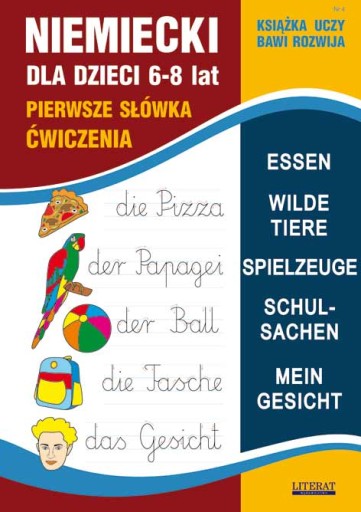 Za pomocą tej książki Twoje dziecko pozna różnorodne słówka, dotyczące następujących tematów: ESSEN, WILDE TIERE, SPIELZEUGE, SCHULSACHEN, MEIN GESICHT.