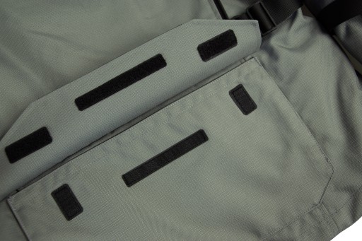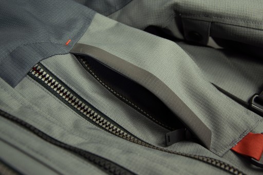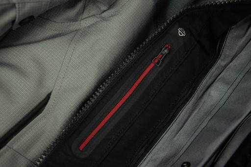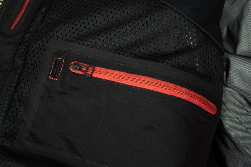 Posiada dwie duże kieszenie z przodu, kieszonkę na piersi oraz dużą kieszeń na plecach. W środku trzy kieszenie zapinane na zamek - jedna na piersi i dwie po bokach, w tym jedną z portem na media. Kolejne kieszenie znajdują się na podpinkach - jedna zapinana na zamek na podpince wodoodpornej i jedna na zatrzask na podpince termicznej.