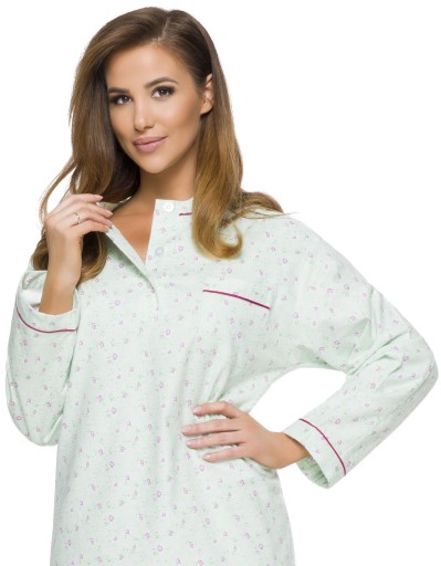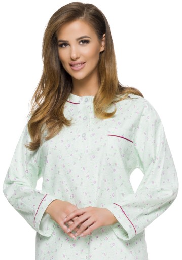 Model z długim rękawem. Całość w kwiatki, trzy guziczki przy szyi, kieszonka na piersi.
