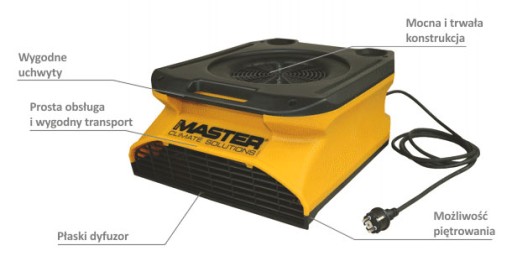 Przypodłogowy wentylator, dmuchawa Master model CDX 20 charakteryzują się mocną i trwałą konstrukcją, prostą obsługą oraz wygodnym transportem. Urządzenia te znajdują swoje zastosowanie w pomieszczeniach, w których należy poprawić wentylację oraz zwiększyć cyrkulację powietrza. Urządzenie dodatkowo wyposażone jest w gniazdo umożliwiające szeregowe łączenie urządzeń. Wentylator posiada dwu stopniową regulację mocy. Wentylator promieniowy pozwala osiągnąć duże osiągi. Urządzenie idealnie nadaję się do suszenia dywanów i ścian.