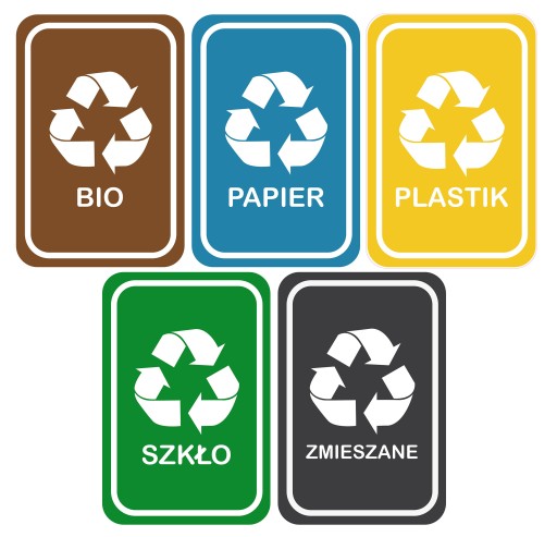 Pięć sztuk dużych naklejek na kosze do segregacji śmieci