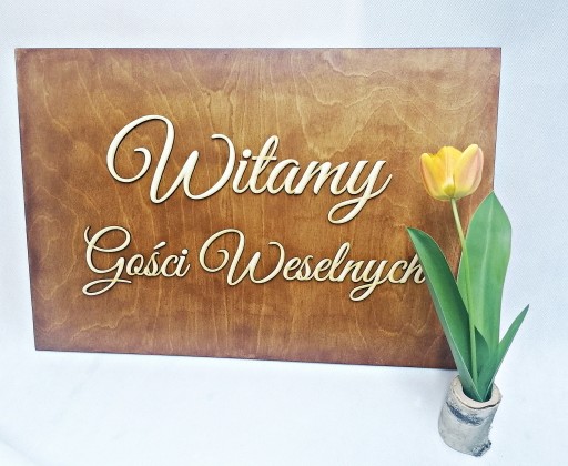 Oferta dotyczy tablicy powitalnej w modnym brązowym kolorze oraz napisu w naturalnym kolorze drewna.