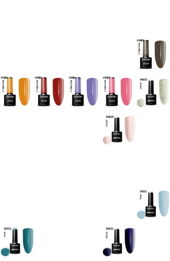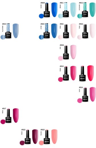 Lakiery hybrydowe SUNONE to 100 idealnie napigmentowanych kolorów, zamkniętych w subtelnej, czarnej, szklanej buteleczce, które widoczne są na nakrętce buteleczki.
