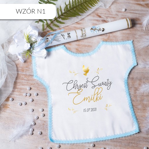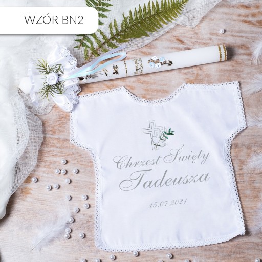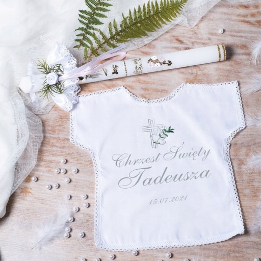 SZATKA I ŚWIECA DO CHRZTU W KRZATŁCIE KOSZULKI W TRZECH KOLORACH Z NADRUKIEM W DWÓCH WERSJACH DO WYBORU.