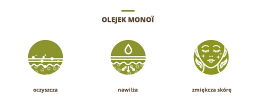 Olejek Monoï jest znany ze swoich właściwości nawilżających, odżywczych i zmiękczających. Na Tahiti już od dawna używany jest jako naturalny kosmetyk – miejscowi chętnie wykorzystują go do pielęgnacji skóry i włosów. Zawiera on duże ilości kwasów o cennych właściwościach pielęgnacyjnych. Świetnie sprawdza się więc w kosmetykach przeznaczonych do każdego typu skóry, nawet dojrzałej i wrażliwej.