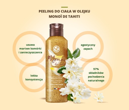 Oczyszczanie i nawilżanie ciała to prawdziwy rytuał. Aby był jeszcze przyjemniejszy, eksperci Yves Rocher stworzyli Peeling do ciała w olejku o zniewalającym zapachu egzotycznych kwiatów tiaré. Dzięki lekkiej konsystencji kosmetyk jest łatwy w aplikacji i pełni podwójną funkcję – oczyszcza jak najlepszy peeling i nawilża jak doskonały balsam. Po jego użyciu skóra jest miękka i pełna blasku, a wakacyjna opalenizna zostaje pięknie podkreślona.