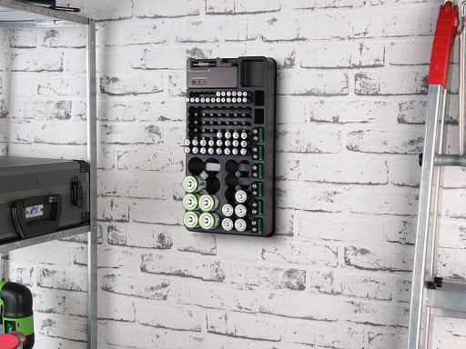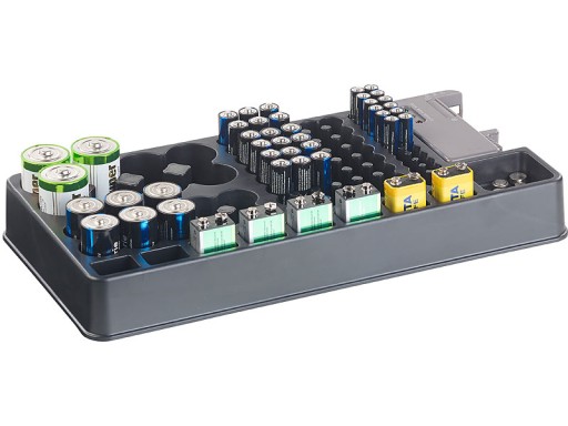 Przydatny w każdym domu, garażu czy warsztacie, pojemnik na baterie, do schowania do szuflady lub do powieszenia na ścianie. Pozwoli on na uporządkowanie różnego rodzaju baterii i ułatwi do nich dostęp. Pomieści aż 98 baterii różnego typu oraz zawiera tester z trzema diodami, dzięki któremu łatwo można sprawdzić czy bateria jest dobra czy zużyta, w całości lub tylko w części.